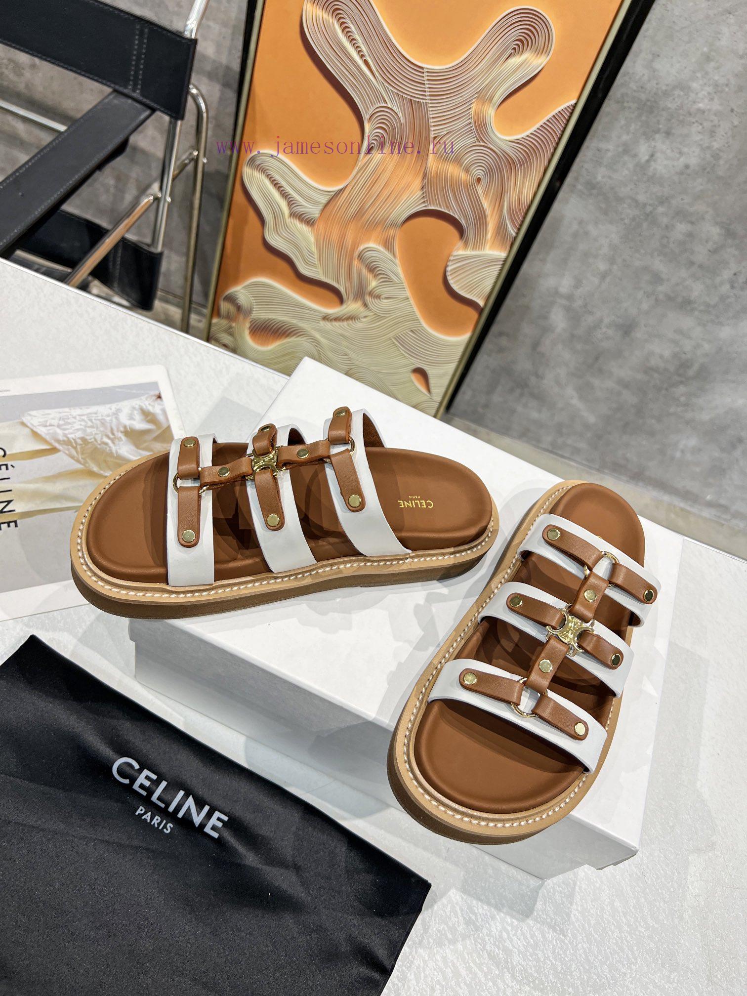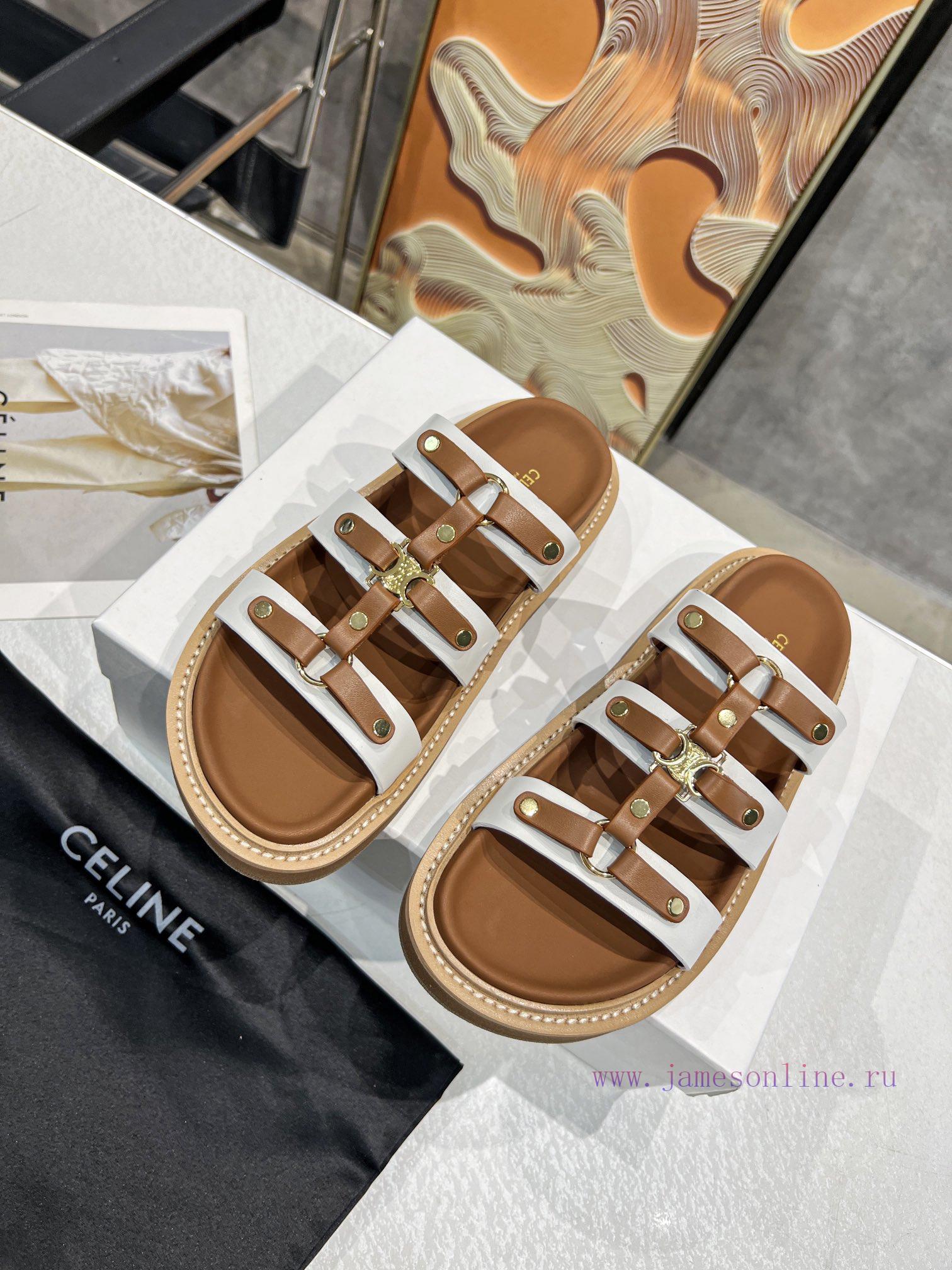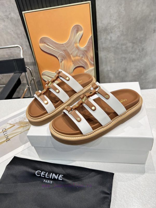 Original replica Celine24 new color Celine Silin TIPPI new contrasting white and brown vegetable tanned cowhide flat slippers 35-41